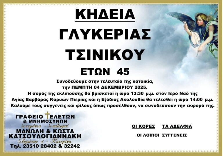 Η κηδεία της θα τελεστεί την Πέμπτη 4 Δεκεμβρίου 2025 και ώρα 13,30 μ.μ., στον Ιερό Ναό της Αγίας Βαρβάρας Καρυών Πιερίας