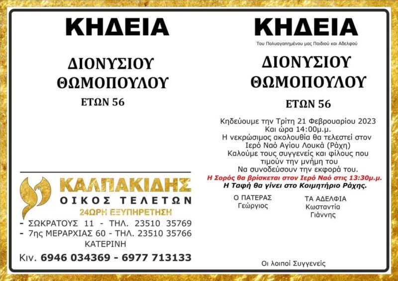 Αξιότιμε πρώην Αντιδήμαρχε Γιώργο Κοκαβίδη Με την παρούσα επιστολή επιθυμούμε να σας εκφράσουμε τις ειλικρινείς και θερμές μας ευχαριστίες για το σημαντικό, πολυεπίπεδο και… ουσιαστικό έργο που επιτελέσατε ως Αντιδήμαρχος Παιδείας, Αθλητισμού και Δημοτικού Ωδείου του Δήμου Κατερίνης. Η προσφορά σας στους κρίσιμους αυτούς τομείς αποτελεί αναμφίβολα πολύτιμο κεφάλαιο για την τοπική κοινωνία και συμβάλλει […]