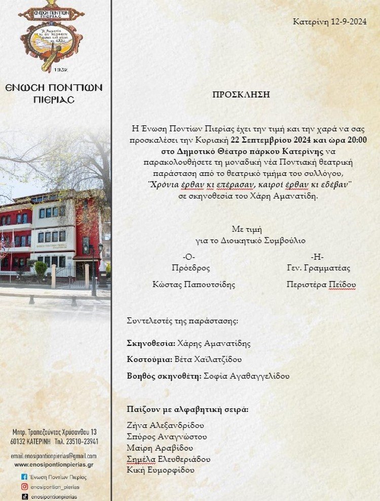 Αξιότιμε πρώην Αντιδήμαρχε Γιώργο Κοκαβίδη Με την παρούσα επιστολή επιθυμούμε να σας εκφράσουμε τις ειλικρινείς και θερμές μας ευχαριστίες για το σημαντικό, πολυεπίπεδο και… ουσιαστικό έργο που επιτελέσατε ως Αντιδήμαρχος Παιδείας, Αθλητισμού και Δημοτικού Ωδείου του Δήμου Κατερίνης. Η προσφορά σας στους κρίσιμους αυτούς τομείς αποτελεί αναμφίβολα πολύτιμο κεφάλαιο για την τοπική κοινωνία και συμβάλλει […]