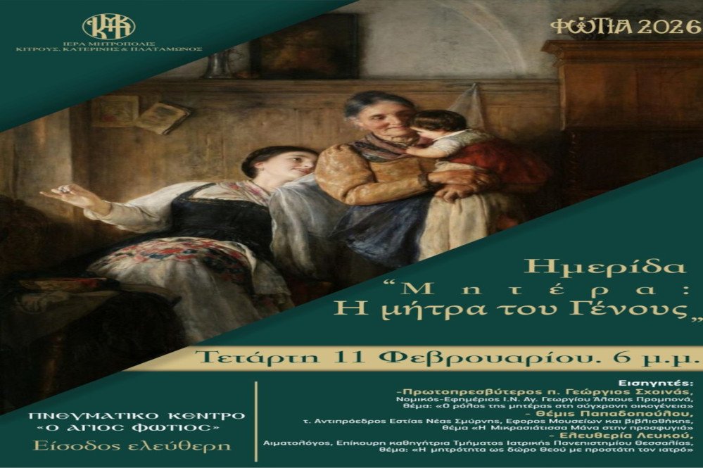 Η Ιερά Μητρόπολη Κίτρους, Κατερίνης και Πλαταμώνος, στο πλαίσιο των πνευματικών και πολιτιστικών εκδηλώσεων «Φώτια 2026», διοργανώνει, την Τετάρτη 11 Φεβρουαρίου και ώρα 6μ.μ. στο Πνευματικό Κέντρο «Άγιος Φώτιος», θεματική ημερίδα με τίτλο «Μητέρα: Η μήτρα του Γένους», αφιερωμένη στο ιερό και ανεκτίμητο πρόσωπο της μητέρας.