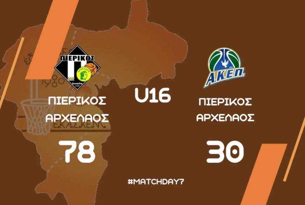Ο Πιερικός Αρχέλαος επικράτησε με 78-30 της ΑΚΕ Πιερίας, στο Κλειστό Γυμναστήριο Σιδηροδρομικού Σταθμού Κατερίνης, σε αγώνα για την 7η αγωνιστική του α’ ομίλου της α’ φάσης του πρωταθλήματος παίδων της ΕΚΑΣΚΕΜ.
