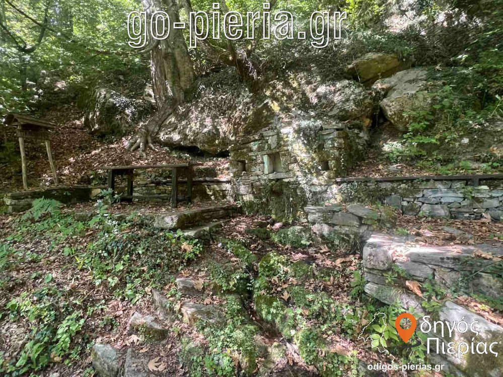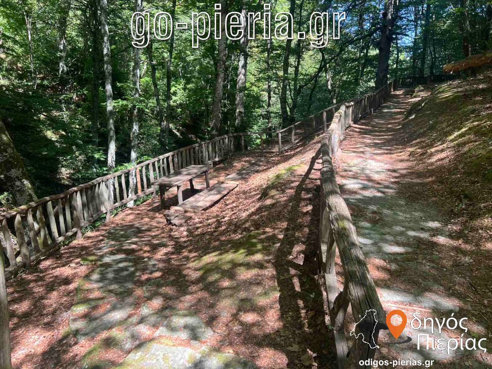 Η διαδρομή ξεκινά από το χωριό και σύντομα σε οδηγεί μέσα σε ένα δάσος που μοιάζει βγαλμένο από παραμύθι. Μικρές πέτρινες βρύσες, ξύλινα τραπεζάκια και σκιερές γωνιές δημιουργούν ιδανικές στάσεις για ξεκούραση και περισυλλογή. Στη μία από τις βρύσες, το νερό κυλά αργά πάνω στα βρύα και τις πέτρες, θυμίζοντας πως η φύση πάντα βρίσκει τον τρόπο να αναπνέει και να προσφέρει.