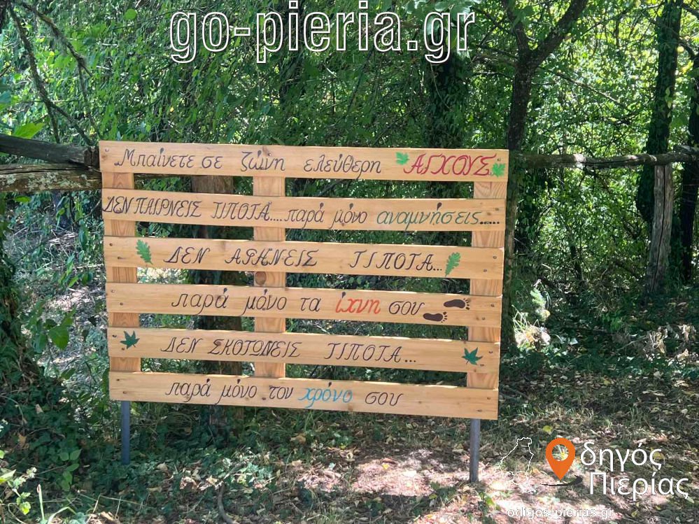 Λίγο πιο κάτω, μια ξύλινη πινακίδα σε υποδέχεται με λόγια που μένουν χαραγμένα στη σκέψη: