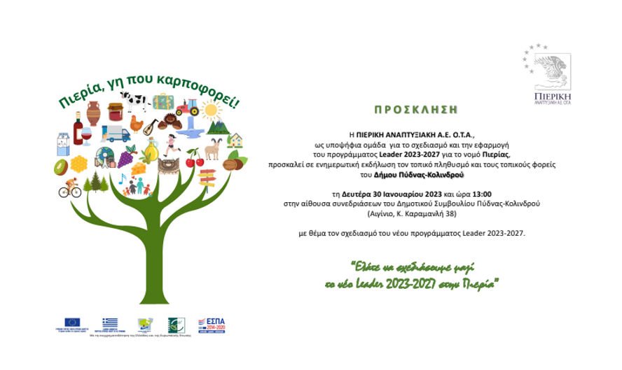 Πιερική Αναπτυξιακή: Τρίτη ενημερωτική εκδήλωση που θα πραγματοποιηθεί στο Δήμο Πύδνας Κολινδρού για όλους τους τοπικούς φορείς για το σχεδιασμό και την εφαρμογή του Προγράμματος