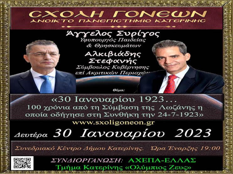 Ακριβώς εκατό χρόνια μετά την έναρξη των συνομιλίων για την Σύμβαση της Λωζάνης την 31η Ιανουαρίου 1923 η Σχολή Γονέων Ανοικτό Πανεπιστήμιο Κατερίνης έχει την εξαιρετική