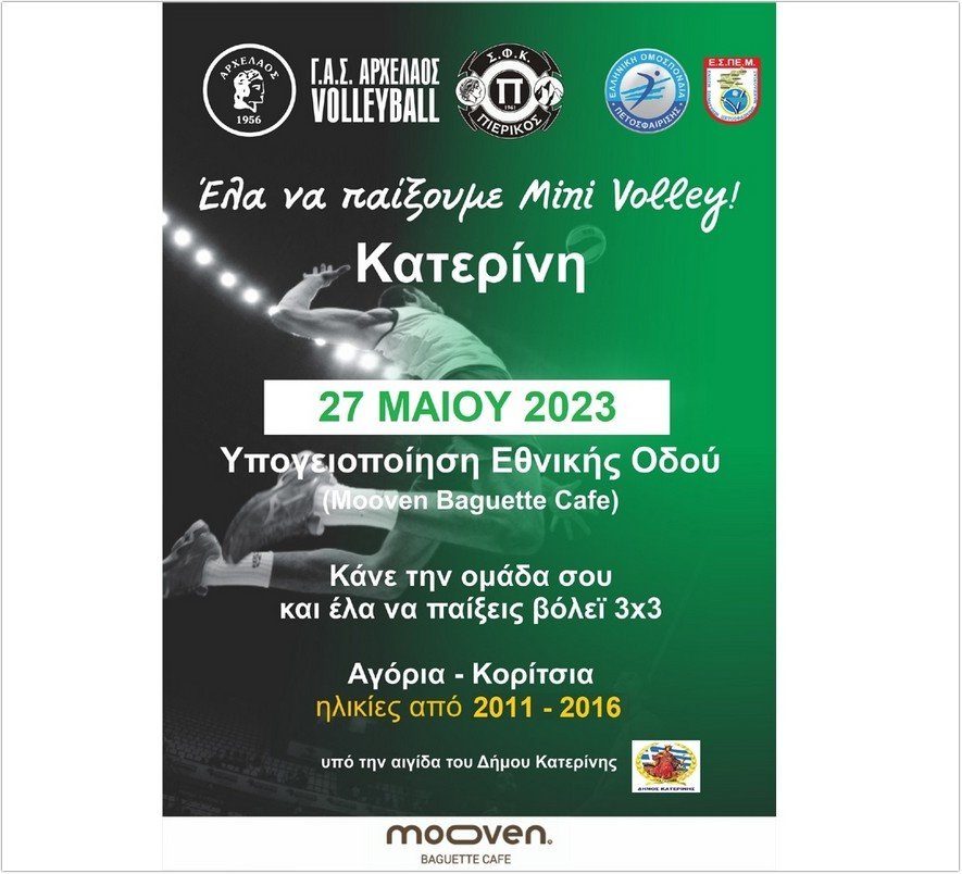 Αγώνες mini volley στην υπογειοποίηση της εθνικής οδού Ο ΓΑΣ Αρχέλαος Κατερίνης σε συνδιοργάνωση με την ΕΣΠΕΜ (Ένωση σωματείων Πετοσφαίρισης Μακεδονίας) και τον ΣΦΚ Πιερικό διοργανώνουν