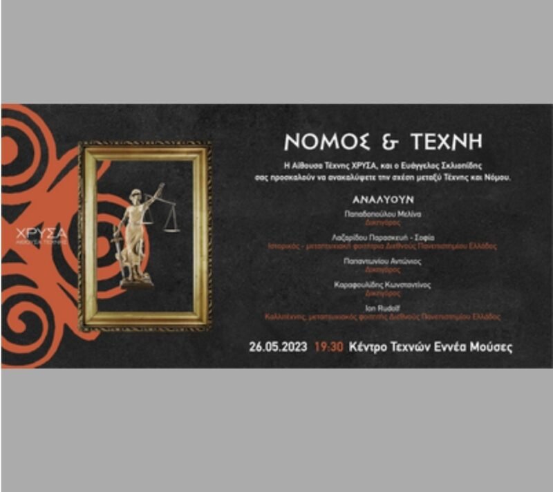 Η Αίθουσα Τέχνης ΧΡΥΣΑ, και ο Ευάγγελος Σκλιοπίδης σας προσκαλούν να ανακαλύψετε την σχέση μεταξύ Τέχνης και Νόμου.Ποια η σχέση τους και η σύνδεση τους.Αναλύουν