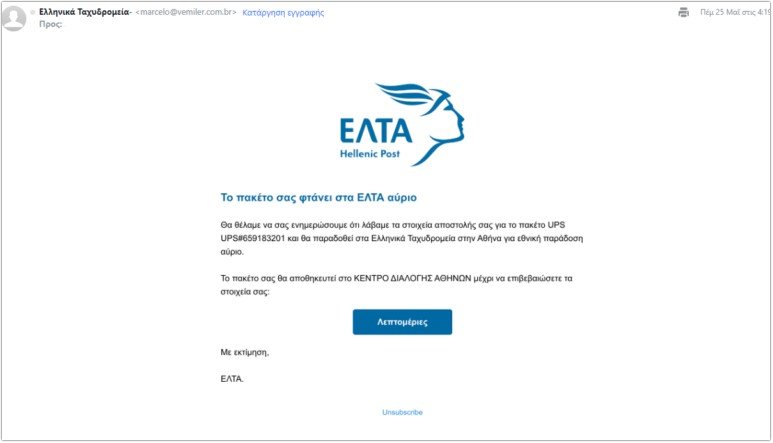 Ηλεκτρονική απάτη με μήνυμα που δήθεν στάλθηκε από τα ΕΛΤΑ Μήνυμα ηλεκτρονικού ταχυδρομείου, που ψευδώς επικαλείται τα ΕΛΤΑ ζητάει στους παραλήπτες να πληκτρολογήσουν τα στοιχεία