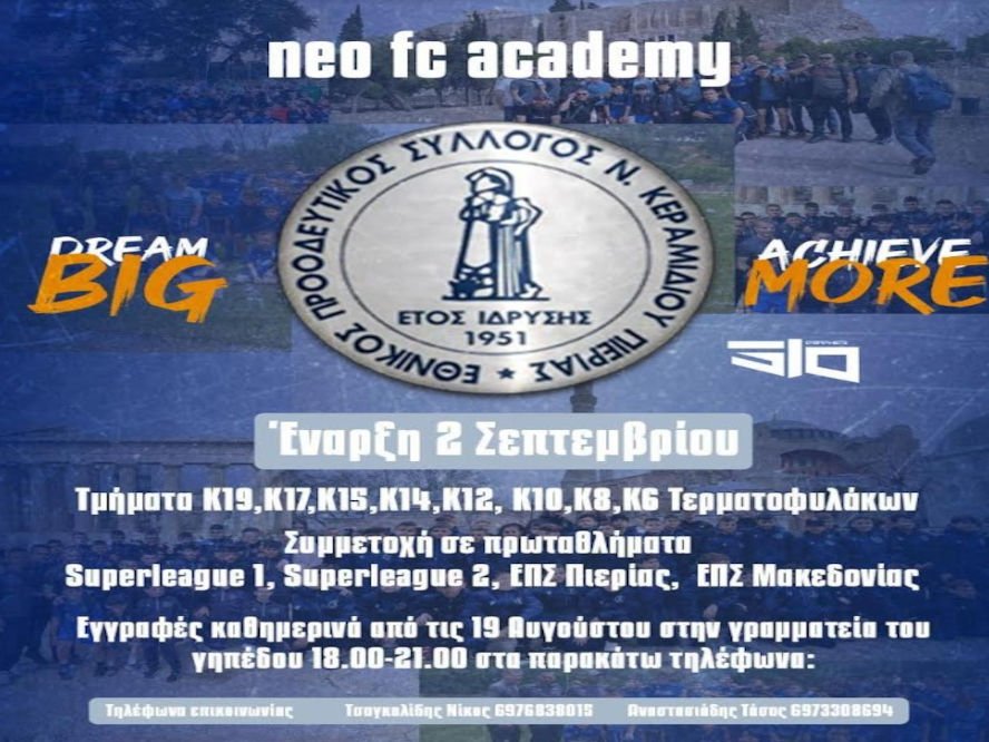 Κατερίνη 16 Αυγούστου 2024 Απο την επόμενη εβδομάδα (Δευτέρα 19/8) ξεκινούν οι εγγραφές στα τμήματα υποδομής μας. Την ίδια ημέρα θα ξεκινήσουν και οι προπονήσεις