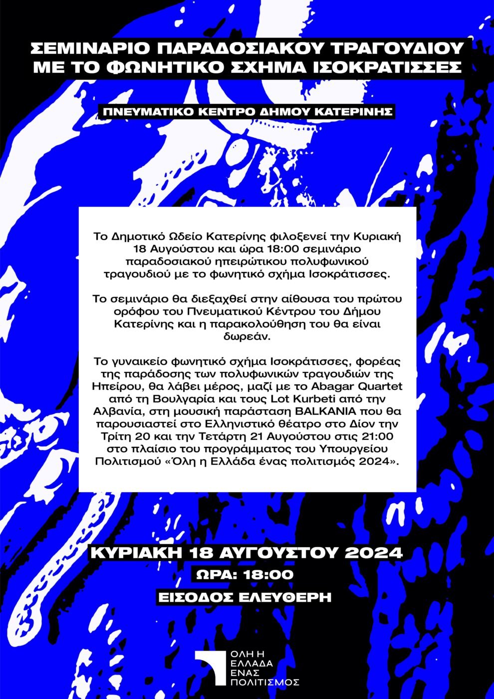 Η εκδήλωση, με δωρεάν είσοδο, θα γίνει την Κυριακή 18/8, ώρα 18.00, στο Πνευματικό Κέντρο του Δήμου Υπό τη φιλοξενία του Δημοτικού Ωδείου Κατερίνης, σεμινάριο