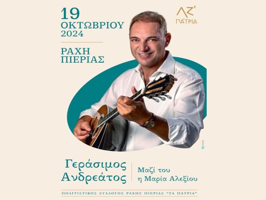 Σάββατο 19 Οκτωβρίου & ώρα 20:00 – Πνευματικό Κέντρο «Πατρίων» Ο Γεράσιμος Ανδρεάτος με αγαπημένα τραγούδια στις αποσκευές του, στα ΛΖ’ Πάτρια, στη Ράχη Πιερίας.