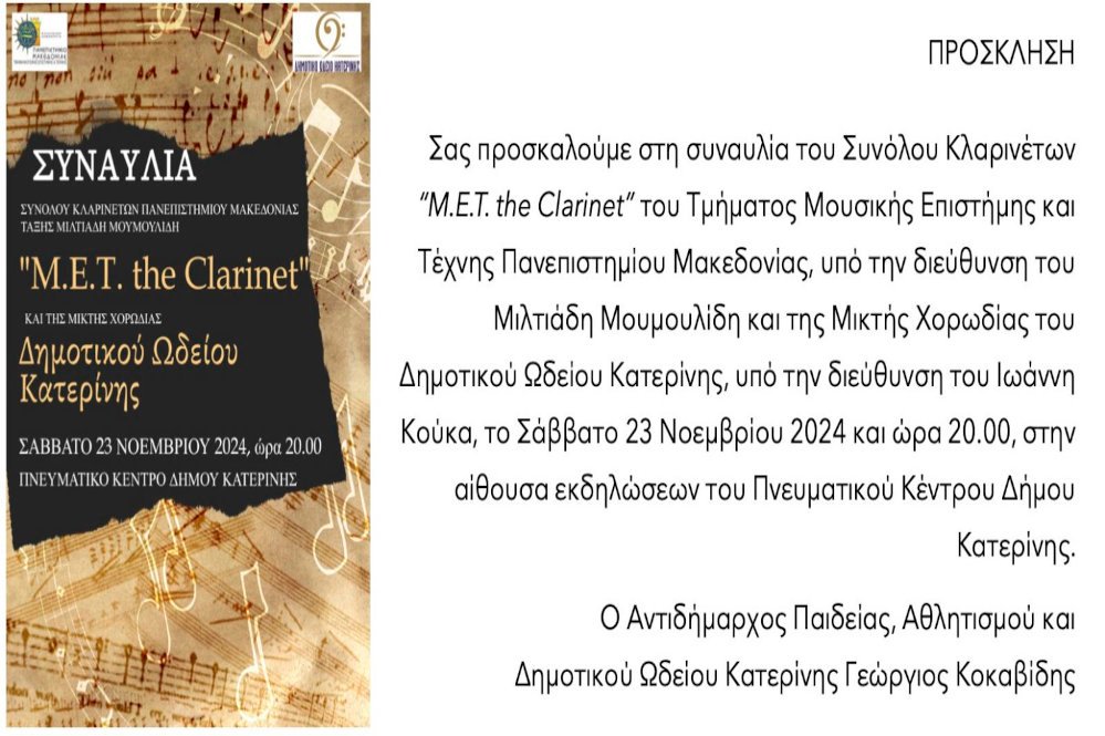 Μια μοναδική συναυλία διοργανώνει το Δημοτικό Ωδείο Κατερίνης σε συνεργασία με τοΤμήμα Μουσικής Επιστήμης και Τέχνης του Πανεπιστημίου Μακεδονίας, το Σάββατο, 23Νοεμβρίου 2024, στις 8:00