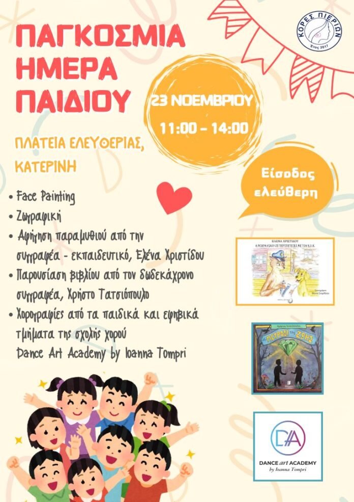 Με αφορμή την Παγκόσμια Ημέρα Παιδιού, ο σύλλογός μας θα πραγματοποιήσει εκδήλωση, το Σάββατο 23 Νοεμβρίου 2024 και ώρες 11:00 – 14:00, στην πλατεία Ελευθερίας!