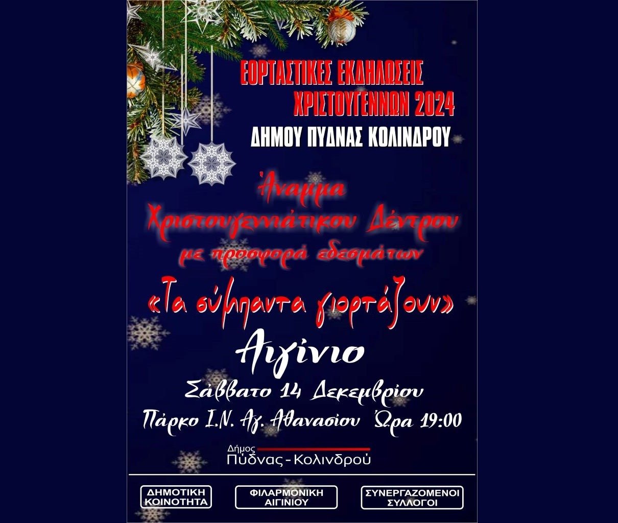 Σάββατο 14 Δεκεμβρίου 2024 και ώρα 19:00. Ο Δήμος Πύδνας-Κολινδρού σας προσκαλεί στην φωταγώγηση του Χριστουγεννιάτικου δέντρου στο Αιγίνιο “Τα σύμπαντα γιορτάζουν” στην Αυλή του