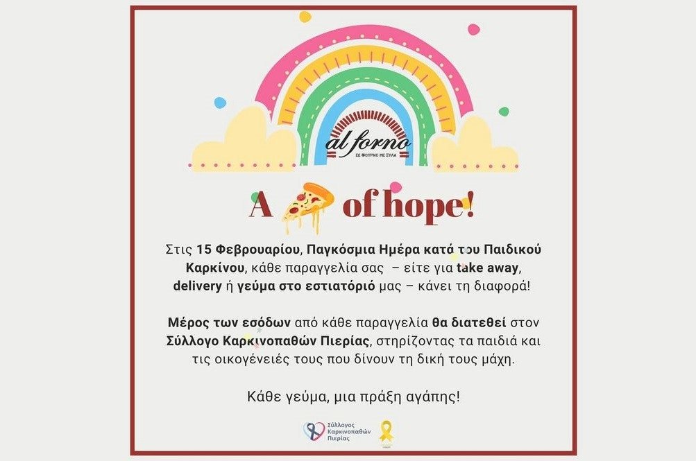 A piece of hope! Κάθε γεύμα μια πράξη αγάπης! Η pizzeria trattoria Al Forno, με αίσθημα εταιρικής κοινωνικής ευθύνης και ευαισθησίας απέναντι στα παιδιά και