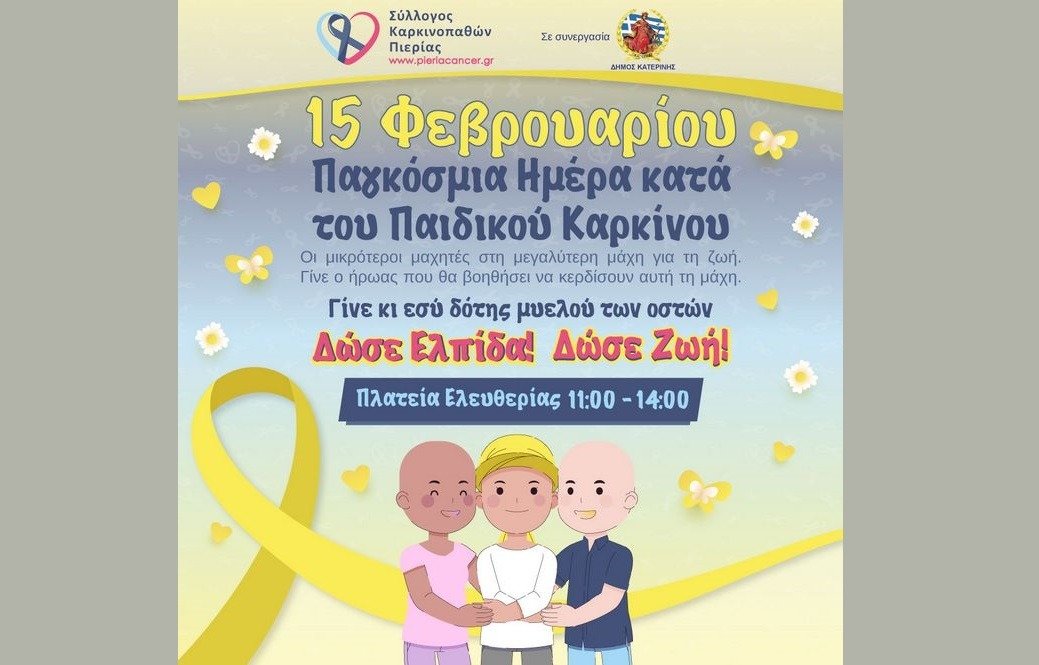 15 Φεβρουαρίου Παγκόσμια Ημέρα Κατά του Παιδικού Καρκίνου Στα πλαίσια της 15ης Φεβρουαρίου Παγκόσμιας Ημέρας κατά του Παιδικού Καρκίνου, ο Σύλλογος Καρκινοπαθών Πιερίας σε συνεργασία με