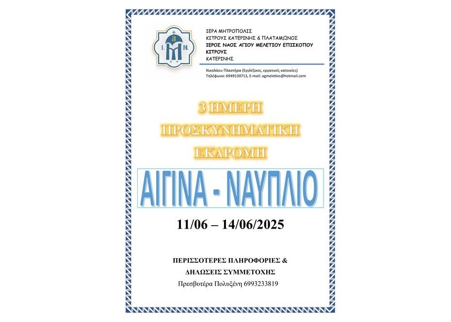 Ο Ιερός Ναός Αγίου Μελετίου Κατερίνης θα πραγματοποιήσει τον ερχόμενο Ιούνιο Προσκυνηματική Εκδρομή στη νήσο Αίγινα καθώς και σε άλλα Προσκυνήματα της Βορείου Πελοποννήσου. Περισσότερες