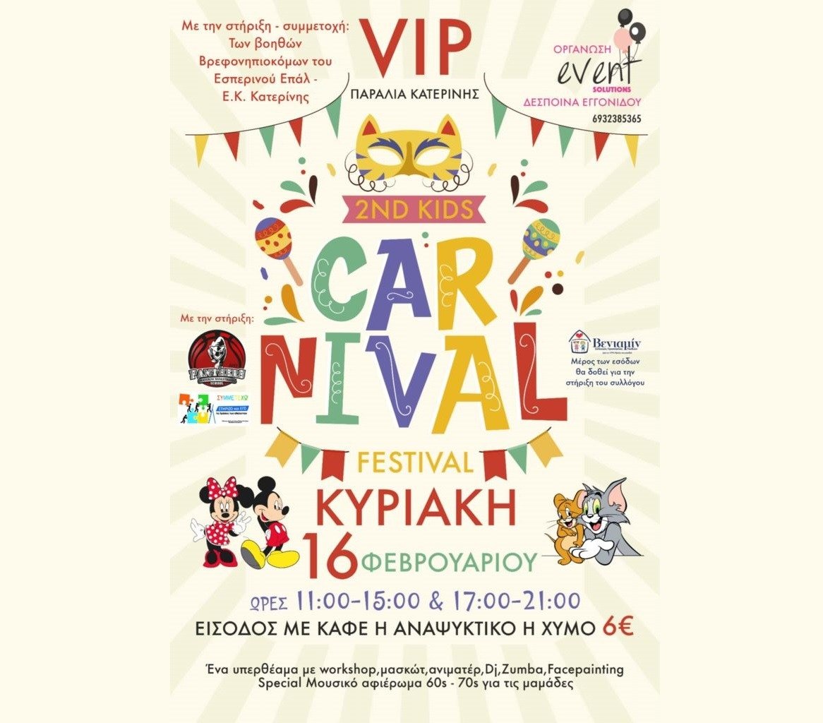 Κυριακή 16-2-25 στην αίθουσα του VIP club στην Παραλία Κατερίνης. Για 2ή χρονιά θα πραγματοποιηθεί το” 2nd Kids Carnival ” ένα Πάρτυ για τους μικρούς