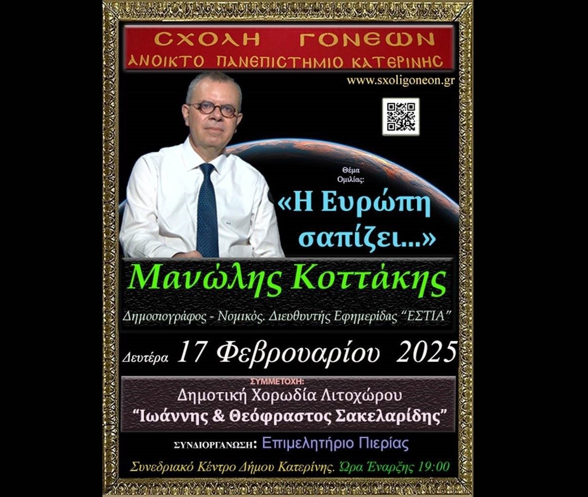 «Η Ευρώπη σαπίζει…». Είναι το θέμα της διάλεξης που θα δώσει την Δευτέρα 17 Φεβρουαρίου 2025 στις 19:00 ο διακεκριμένος δημοσιογράφος, Νομικός και Διευθυντής της Εφημερίδας «ΕΣΤΙΑ» κ. Μανόλης