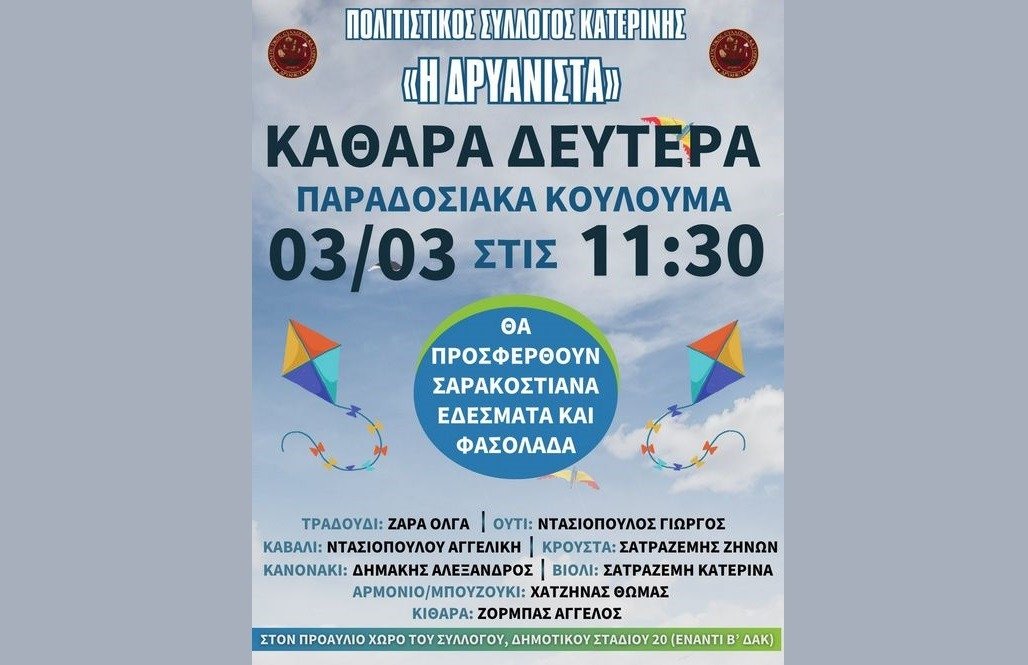Ο Δήμος Δίου-Ολύμπου σας προσκαλεί στο τριήμερο εορταστικών εκδηλώσεων το Σαββατοκύριακο της Αποκριάς, 1 και 2 Μαρτίου και την Καθαρά Δευτέρα 3 Μαρτίου 2025. Διαβάστε