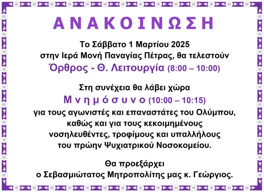 Το Σάββατο Μνημόσυνο για τους Αγωνιστές της Επανάστασης του Ολύμπου στην Ιερά Μονή Παναγίας Πέτρας Ολύμπου.