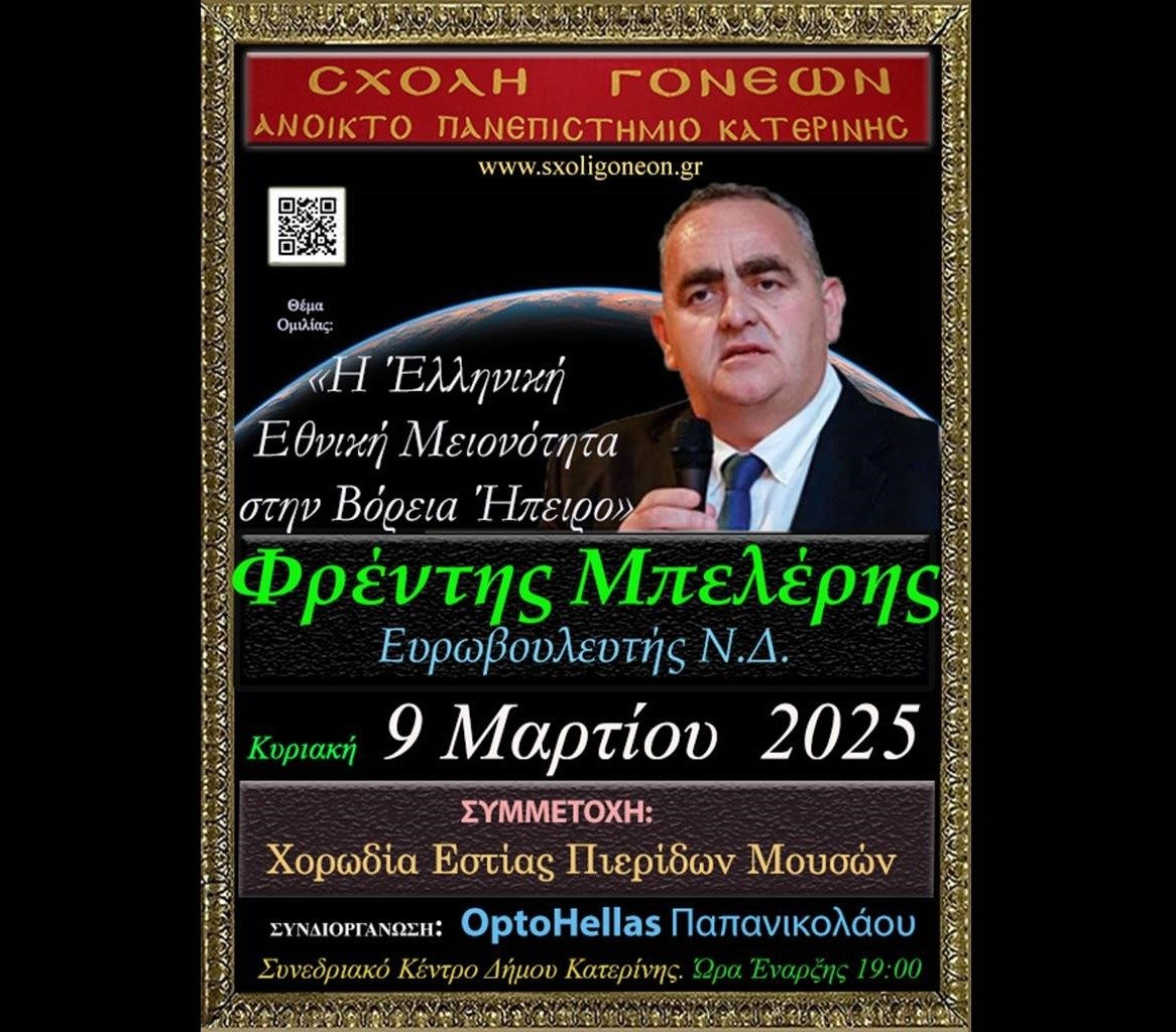 Ο Ευρωβουλευτής της Ν.Δ. κ. Φρέντης Μπελέρης είναι ο επίσημος ομιλητής και καλεσμένος την ΚΥΡΙΑΚΗ 9 Μαρτίου 2025 της Σχολής Γονέων – Ανοικτό Πανεπιστήμιο Κατερίνης.