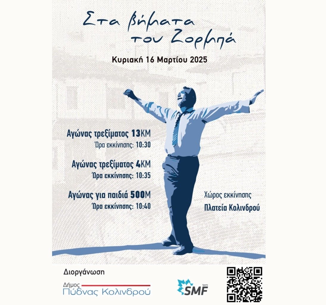 Ο Δήμαρχος Πύδνας Κολινδρού, Χρήστος Κομπατσιάρης, σας καλεί να τιμήσετε με την παρουσία σας την αθλητική εκδήλωση «Στα βήματα του Ζορμπά», που θα πραγματοποιηθεί την