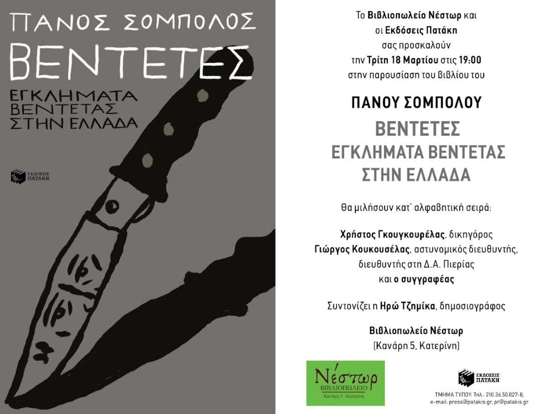 Θα μιλήσουν κατ’ αλφαβητική σειρά: Χρήστος Γκουγκουρέλας, δικηγόρος Γιώργος Κουκουσέλας, αστυνομικός διευθυντής, διευθυντής στη Δ.Α Πιερίας και ο συγγραφέας Πάνος Σόμπολος Συντονίζει η Ηρώ Τζημίκα, δημοσιογράφος ———————