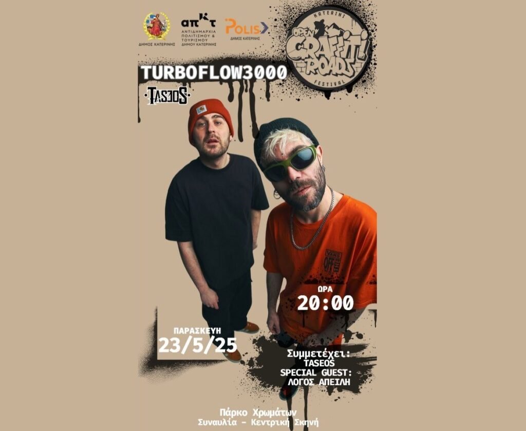 Turboflow3000 στο OPENROADS/Graffiti Festival 2025 Σήμερα & Ώρα 20:00 – Πάρκο Χρωμάτων/Κεντρική Σκηνή Το ντουέτο που έφερε το «ΟΥΦΟ» στην ελληνική σκηνή επιστρέφει με «FomoFomoFomo» και έρχεται να κάνει χαμό στο OPENROADS/Graffiti Festival! Synth-pop, rap, electro και δυναμισμός στην κεντρική σκηνή. Συμμετέχει: TASEOSSPECIAL GUEST: ΛΟΓΟΣ ΑΠΕΙΛΗ Μην τους χάσετε!Είσοδος: ελεύθερη