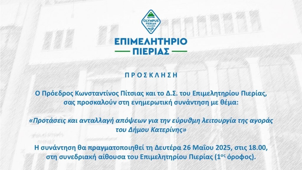 Ο Πρόεδρος Κωνσταντίνος Πίτσιας και το Δ.Σ. του Επιμελητηρίου Πιερίας, σας προσκαλούν στη ενημερωτική συνάντηση με θέμα: «Προτάσεις και ανταλλαγή απόψεων για την εύρυθμη λειτουργία της αγοράς του Δήμου Κατερίνης» Η συνάντηση θα πραγματοποιηθεί τη Δευτέρα 26 Μαΐου 2025, στις 18.00, στη συνεδριακή αίθουσα του Επιμελητηρίου Πιερίας (1ος όροφος).