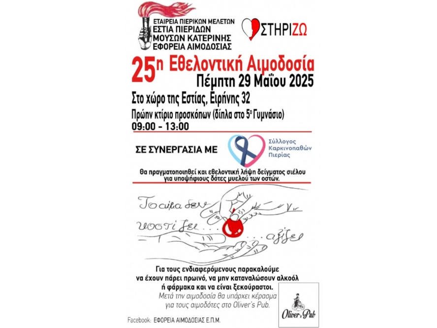 Εστία Πιερίδων Μουσών Πιερίας: Πρόσκληση σε Εθελοντική Αιμοδοσία