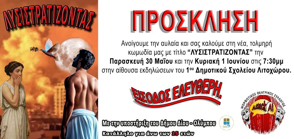 Μια εξωφρενική κωμωδία που δεν έχει ξαναπαιχτεί επί σκηνής, παρουσίαζει ο Μορφωτικός Θεατρικός Σύλλογος «Attack-a» την Παρασκευή 30 Μαΐου καί την Κυριακή 1 Ιουνίου στις