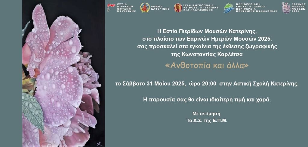 Το Σάββατο 31 Μαΐου στις 8 μ.μ. θα πραγματοποιηθούν τα εγκαίνια της ατομικής έκθεσης της Κωνσταντίνας Καρλέτσα με θέμα “Ανθοτοπία και άλλα” στο πλαίσιο των
