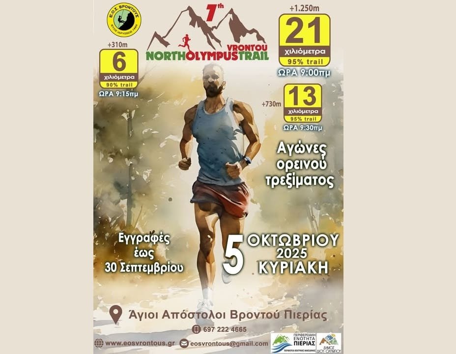 Ο Ε.Ο.Σ. Βροντούς διοργανώνει για 7η χρονιά τον αγώνα ορεινού τρεξίματος “North Olympus Trail”, την Κυριακή 5 Οκτωβρίου 2025 στους Αγίους Αποστόλους Βροντούς Πιερίας. Οι
