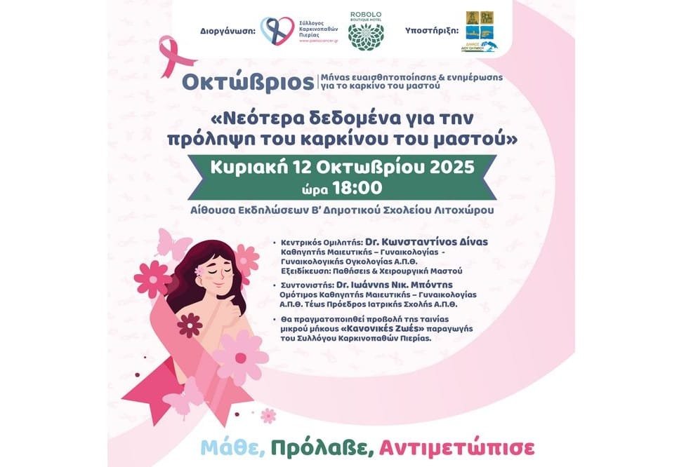 Με αφορμή τον Οκτώβριο, μήνα αφιερωμένο στην ενημέρωση και πρόληψη του καρκίνου του μαστού ο Σύλλογος Καρκινοπαθών Πιερίας, σε συνεργασία με το Robolo Boutique Hotel