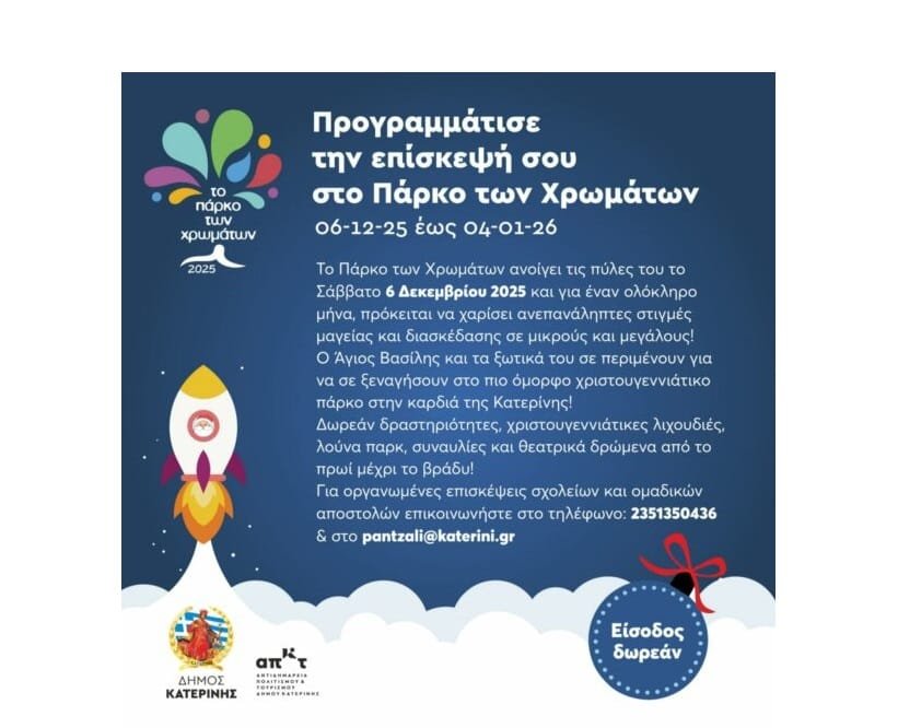 Το πάρκο των χρωμάτων 2025Προγραμμάτισε την επίσκεψή σου στο Πάρκο των Χρωμάτων06-12-25 έως 04-01-26. Το Πάρκο των Χρωμάτων ανοίγει τις πύλες του το Σάββατο 6