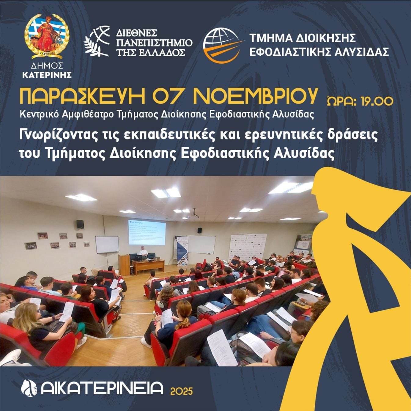 ΠΑΡΑΣΚΕΥΗ 07 ΝΟΕΜΒΡΙΟΥ ΩΡΑ: 19.00 Κεντρικό Αμφιθέατρο Τμήματος Διοίκησης Εφοδιαστικής Αλυσίδας Γνωρίζοντας τις εκπαιδευτικές και ερευνητικές δράσεις του Τμήματος Διοίκησης Εφοδιαστικής Αλυσίδας Ομιλία: Δημήτριος Αηδόνης,