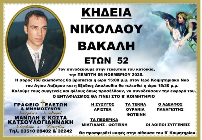 Με θλίψη ανακοινώνουμε ότι έφυγε από τη ζωή ο Νικόλαος Βακάλης, σε ηλικία 52 ετών, σκορπίζοντας βαθιά οδύνη σε συγγενείς και φίλους. Η κηδεία του