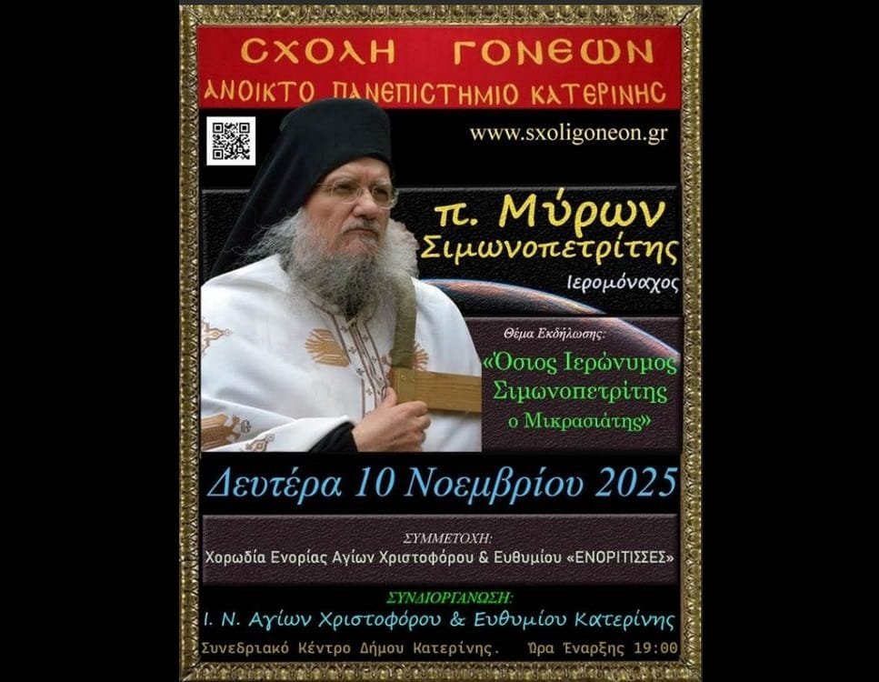 Ο Ὁσιολογιώτατος Ἁγιορείτης Ἱερομόναχος π. Μύρων Σιμωνοπετρίτης είναι ο επίσημος ομιλητής και καλεσμένος της Σχολής Γονέων – Ανοικτό Πανεπιστήμιο Κατερίνης την Δευτέρα 10 Νοεμβρίου 2025 ο οποίος θα μας μιλήσει για τον Όσιο Ιερώνυμο. Η εκδήλωση γίνεται σε Συνδιοργάνωση με τον Ι.Ν. Αγίων Χριστοφόρου & Ευθυμίου Κατερίνης.Στην έναρξη της εκδήλωσης θα ακουστούν χορωδιακά τραγούδια από την Χορωδία της Ενορίας Αγίων Χριστοφόρου & Ευθυμίου “ΕΝΟΡΙΤΙΣΣΕΣ“. Ο Όσιος Ιερώνυμος γεννήθηκε στο χωριό Ρεΐζ-Δερέ της επαρχίας Κρήνης Μικράς Ασίας το 1871 μ.Χ. από φτωχούς και ευσεβείς γονείς. Το χωριό του ήταν καθαρά χριστιανικό και βρισκόταν πέντε χιλιόμετρα βορειανατολικά από τ’ Αλάτσατα και δυόμιση χιλιόμετρα από τη θάλασσα. Οι περισσότεροι κάτοικοι ήσαν γεωργοί και αμπελουργοί και προέρχονταν από την Κρήτη και την Πελοπόννησο.Στη βάπτισή του έλαβε το όνομα Ιωάννης. Η εκκλησία του χωριού έγινε κέντρο της ζωής του. Εκεί εύρισκε ό,τι ζητούσε η ψυχή του. Τη χαρά και την ευλογία του Θεού, που χυνόταν πάνω του με τα μυστήρια, τις προσευχές, τις διακονίες. Αγαπούσε τις ιερές ακολουθίες, τους ιερείς, τους ψάλτες, τις αγρυπνίες, τα εξωκκλήσια. Βοηθούσε στο ψαλτήρι τους ιεροψάλτες και στο άγιο βήμα τους ιερείς. Από μικρός έδειχνε μεγάλος με τη σιωπή, τη σοβαρότητα και την ευλάβειά του. Τα επίλοιπα στην ομιλία του π. Μύρωνα. Με εκτίμηση Για το Δ.Σ. Ο Πρόεδρος