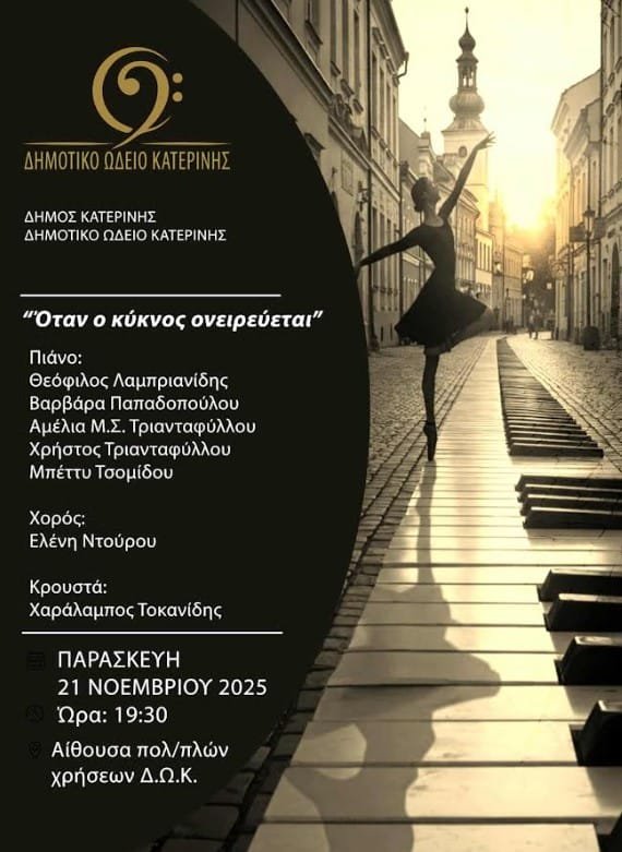 Tη μουσικοχορευτική βραδιά «Όταν ο κύκνος ονειρεύεται», παρουσιάζει το Δημοτικό Ωδείο Κατερίνης, μια συνάντηση ήχων και κινήσεων, όπου το πιάνο, ο χορός και τα κρουστά