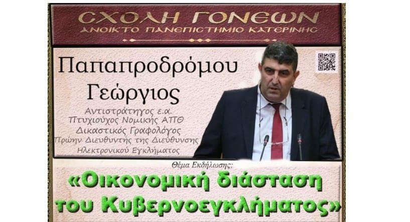 Ο αντιστράτηγος ε.α.. πτυχιούχος Νομικής Α.Π.Θ., Δικαστικός γραφολόγος & πρώην Διευθυντής της Διεύθυνσης Ηλεκτρονικού Εγκλήματος της Ελληνικής Αστυνομίας Γεώργιος Παπαπροδρόμου είναι ο ομιλητής στο Ανοικτό Πανεπιστήμιο Κατερίνης την Δευτέρα 1η Δεκεμβρίου 2025 στις 19:00 με θέμα: «Οικονομική διάσταση του Κυβερνοεγκλήματος»Στην έναρξη της εκδήλωσης θα ακουστούν χορωδιακά τραγούδια του Συλλόγου Κολινδρινών Κατερίνης και Ιερού Ναού Αγίας Θεοδώρας Κολινδρού υπό την διεύθυνση του κ. Πατρόκλου Παπαγιάννη. Σε μια εποχή κορύφωσης των νέων τεχνολογιών και του διαδικτύου που διαμορφώνουν τον νέο κοινό μας χώρο, τον Κυβερνοχώρο, αναδύονται όλο και περισσότερες μορφές εγκλημάτων, νέων και εξελιγμένων παραδοσιακών.Αποτέλεσμα του συνδυασμού έλλειψης ψηφιακών δεξιοτήτων και κενών Κυβερνοασφάλειας οι συγκεκριμένες αντικοινωνικές συμπεριφορές έχουν πολλαπλό αντίκτυπο, με κυρίαρχο τον οικονομικό-κοινωνικό αντίκτυπο.Την πτυχή αυτής της διάστασης του Κυβερνοεγκλήματος θα προσεγγίσει ο ομιλητής της εκδήλωσης με τεκμηριωμένα στοιχεία αλλά και με συγκεκριμένες προτάσεις για την αντιμετώπιση του (σε ατομικό και συλλογικό επίπεδο). ΒΙΟΓΡΑΦΙΚΟΟ Αντιστράτηγος ε.α. Γιώργος Παπαπροδρόμου γεννήθηκε στα Γιαννιτσά Πέλλας και μεγάλωσε στο χωριό Εσώβαλτα Πέλλας.Υπηρέτησε σε διάφορες υπηρεσίες της Ελληνικής Αστυνομίας από το 1984 έως το 2019, κι αποστρατεύθηκε από την Ελληνική Αστυνομία, έχοντας σήμερα το βαθμό του Αντιστρατήγου εα.Διετέλεσε, μεταξύ άλλων, Διευθυντής στην νεοιδρυθείσα Υποδιεύθυνση Δίωξης Ηλεκτρονικού Εγκλήματος Βορείου Ελλάδος (2015), και στη συνέχεια (2016-2018) Διευθυντής στην Διεύθυνση Δίωξης Ηλεκτρονικού Εγκλήματος του Αρχηγείου της Ελληνικής Αστυνομίας.Είναι πτυχιούχος της Νομικής Σχολής του Αριστοτελείου Πανεπιστημίου Θεσσαλονίκης (1991),