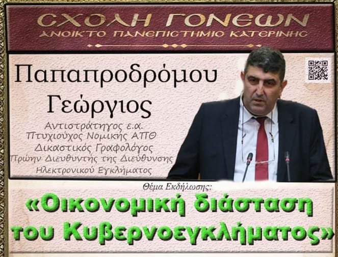 Ο αντιστράτηγος ε.α.. πτυχιούχος Νομικής Α.Π.Θ., Δικαστικός γραφολόγος & πρώην Διευθυντής της Διεύθυνσης Ηλεκτρονικού Εγκλήματος της Ελληνικής Αστυνομίας Γεώργιος Παπαπροδρόμου είναι ο ομιλητής στο Ανοικτό Πανεπιστήμιο Κατερίνης την Δευτέρα 1η Δεκεμβρίου 2025 στις 19:00 με θέμα: «Οικονομική διάσταση του Κυβερνοεγκλήματος» H εκδήλωση γίνεται σε συνδιοργάνωση με την Διεύθυνση Αστυνομίας Πιερίας.Στην έναρξη θα ακουστούν χορωδιακά τραγούδια του Συλλόγου Κολινδρινών Κατερίνης και Ιερού Ναού Αγίας Θεοδώρας Κολινδρού υπό την διεύθυνση του κ. Πατρόκλου Παπαγιάννη. Σε μια εποχή κορύφωσης των νέων τεχνολογιών και του διαδικτύου που διαμορφώνουν τον νέο κοινό μας χώρο, τον Κυβερνοχώρο, αναδύονται όλο και περισσότερες μορφές εγκλημάτων, νέων και εξελιγμένων παραδοσιακών.Αποτέλεσμα του συνδυασμού έλλειψης ψηφιακών δεξιοτήτων και κενών Κυβερνοασφάλειας οι συγκεκριμένες αντικοινωνικές συμπεριφορές έχουν πολλαπλό αντίκτυπο, με κυρίαρχο τον οικονομικό-κοινωνικό αντίκτυπο.Την πτυχή αυτής της διάστασης του Κυβερνοεγκλήματος θα προσεγγίσει ο ομιλητής της εκδήλωσης με τεκμηριωμένα στοιχεία αλλά και με συγκεκριμένες προτάσεις για την αντιμετώπιση του (σε ατομικό και συλλογικό επίπεδο).
