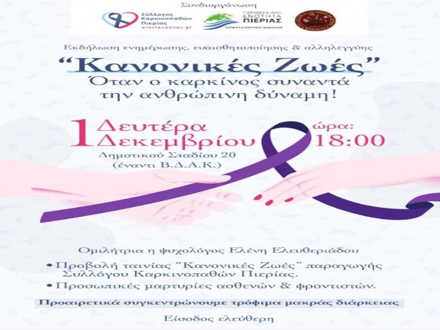 Ο Σύλλογος Καρκινοπαθών Πιερίας και ο Πολιτιστικός Σύλλογος “ΔΡΥΆΝΙΣΤΑ” σε συνδιοργάνωση με την Περιφερειακή Ενότητα Πιερίας σας προσκαλεί σε μια ξεχωριστή βραδιά αφιερωμένη στην ψυχοκοινωνική