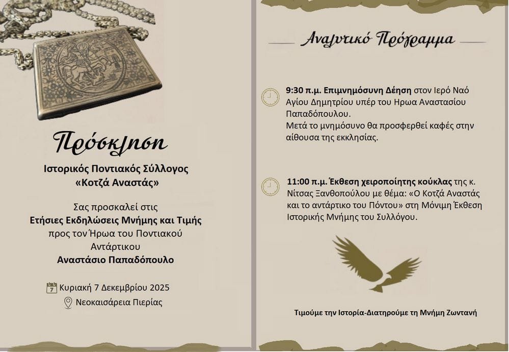 Ο Ιστορικός Ποντιακός Σύλλογος «Κοτζά Αναστάς» ανακοινώνει ότι το ετήσιο μνημόσυνο του ήρωα του Ποντιακού Ανταρτικού, Αναστασίου Παπαδόπουλου, θα τελεστεί στην εκκλησία του Αγίου Δημητρίου στη Νεοκαισάρεια, την Κυριακή 7 Δεκεμβρίου 2025, ώρα