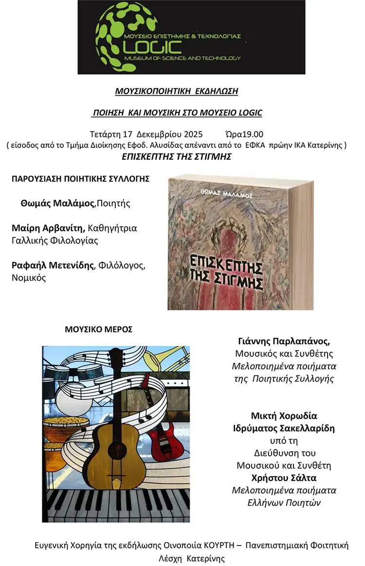 Πολιτιστική εκδήλωση με τίτλο «Ποίηση και μουσική στο Μουσείο LOGIC» θα πραγματοποιηθεί την Τετάρτη 17 Δεκεμβρίου 2025, στις 19:00, στον χώρο του Μουσείου LOGIC. Στο επίκεντρο της βραδιάς βρίσκεται η παρουσίαση
