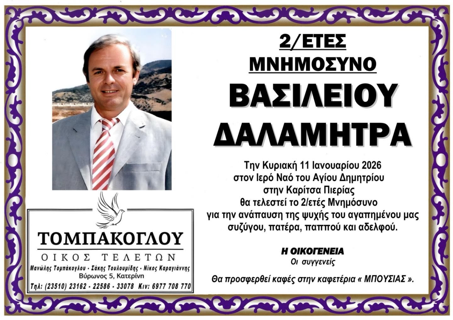 Την Κυριακή 11 Ιανουαρίου 2026 θα τελεστεί το 2ετές Μνημόσυνο υπέρ αναπαύσεως της ψυχής του Βασιλείου Δαλαμήτρα,στον Ιερό Ναό Αγίου Δημητρίου στην Καρίτσα Πιερίας. Η