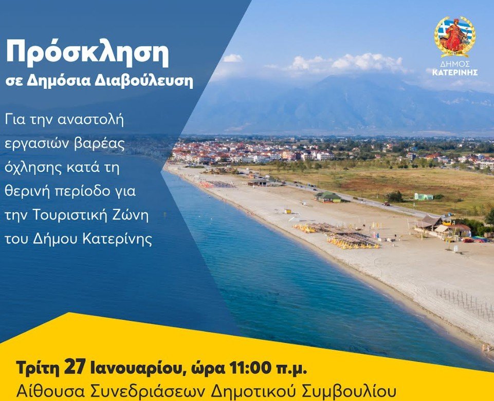 Αξιότιμοι εκπρόσωποι των φορέων του Δήμου Κατερίνης, Ο Δήμος μας, ενόψει της έλευσης τουριστικής περιόδου, εκκινεί τη διαδικασία διαβούλευσης για τον καθορισμό του πλαισίου λειτουργίας