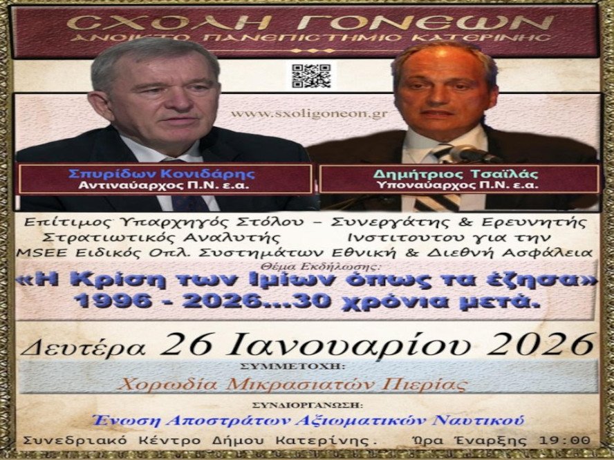 O Αντιναύαρχος Π.Ν. ε.α. Σπυρίδων Κονιδάρης και ο Υποναύαρχος Π.Ν. ε.α. Δημήτριος Τσαΐλάς θα είναι οι επίσημοι ομιλητές και καλεσμένοι της Σχολής Γονέων – Ανοικτό Πανεπιστήμιο Κατερίνης την Δευτέρα