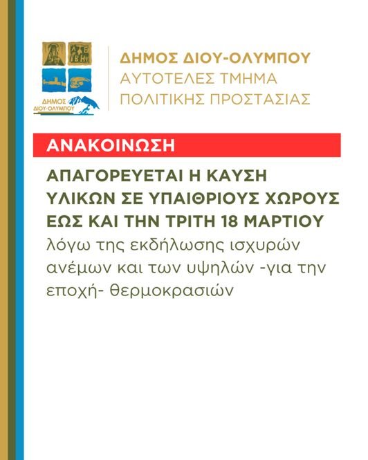 Το Αυτοτελές Τμήμα Πολιτικής Προστασίας του Δήμου Δίου-Ολύμπου ενημερώνει τους πολίτες ότι σύμφωνα με ανακοίνωση του Υπουργείου Πολιτικής Προστασίας και Κλιματικής Κρίσης, απαγορεύεται έως και την Τρίτη 18 Μαρτίου 2025 η καύση, π.χ. υπολειμμάτων καλλιεργειών, σε υπαίθριους χώρους (π.χ. οικοπεδικές, αγροτικές και δασικές εκτάσεις), λόγω της εκδήλωσης ισχυρών ανέμων και υψηλών -για την εποχή- θερμοκρασιών.