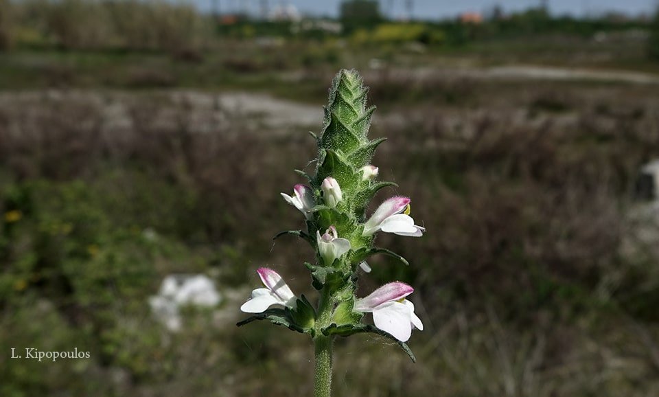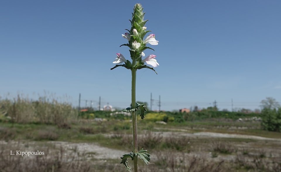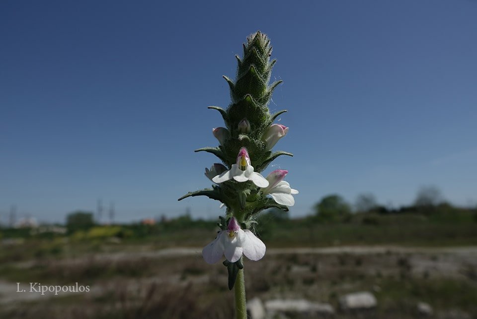 Τα φύλλα του είναι πριονωτά και στο πάνω μέρος του φυτού σχηματίζεται η ταξιανθία του με μοβ και λευκά χείλη.